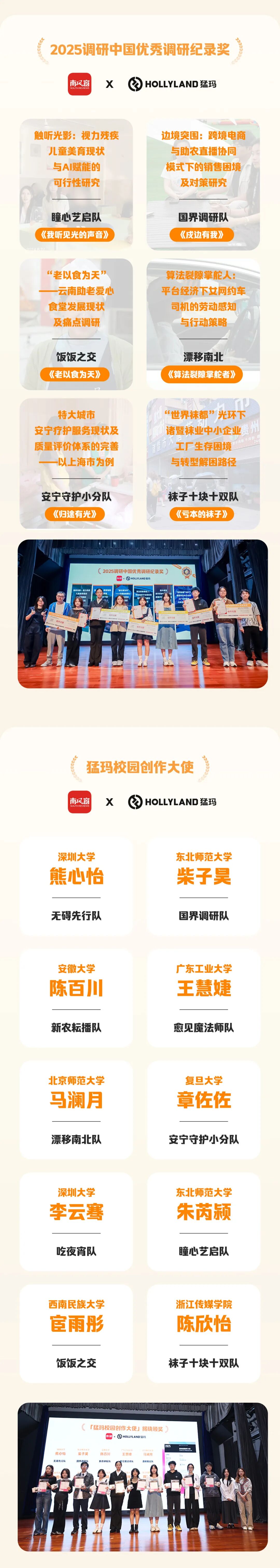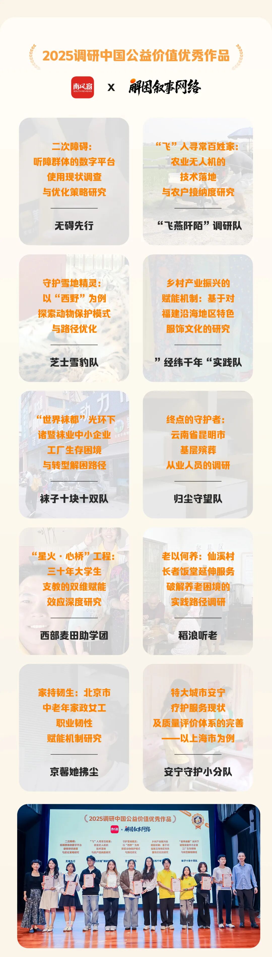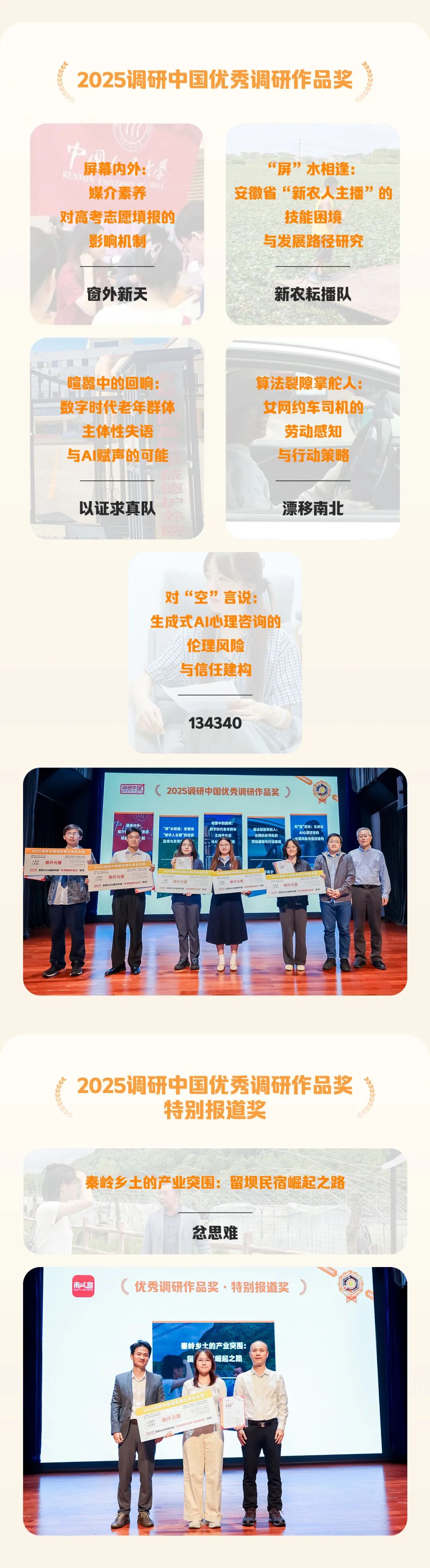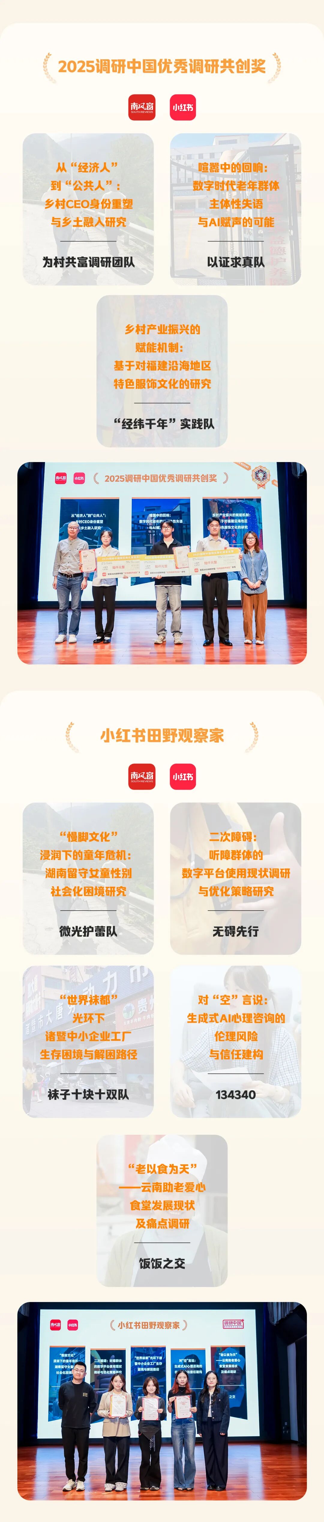 本年度共有12位评委、25支获奖团队汇聚一堂,一起见证十强一二三等奖的精彩角逐,与“优秀调研专题奖”“优秀调研共创奖”“优秀调研纪录奖”“优秀调研作品奖”等多个重磅奖项等重磅奖项的揭晓。